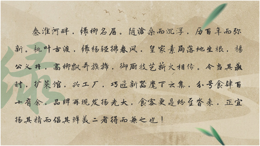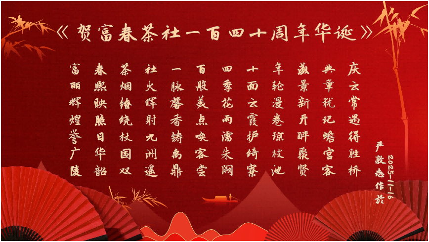 严董事长向与会嘉宾分享了古南都保护和重建老字号的体会,强调了发掘和建设老字号企业文化的重要性,现场展示了《绿柳素食赋》。严董事长特创作藏头诗《富春茶社一百四十年盛典庆》,向富春集团谨表祝贺:“富丽辉煌誉广陵,春熙映照日华韶。茶烟缭绕杖国双,社火晖射九州遥。一脉馨香铸禹鼎,百般美点唤客尝。四季花雨濡朱阙,十面云霞护绮寮。年轮漫卷琼汁池,盛景新开醉聚贤。典章犹记蟾宫客,庆云常遇得胜桥。”